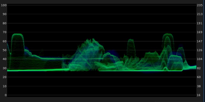 ダイナミックレンジを広げるために極端なパラメータの設定をしてしまうと、コントラストが強すぎる映像になってしまいますので、波形の0と100を超えないように設定します。