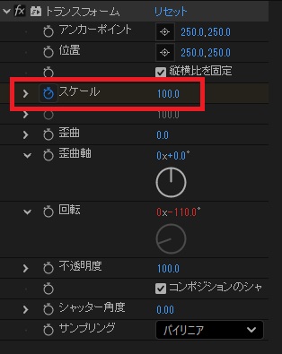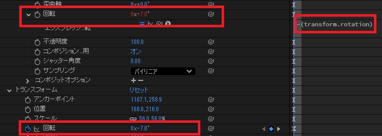 ②「エフェクト:トランスフォーム」の回転にエクスプレッション「-(transform.rotation)」と入力