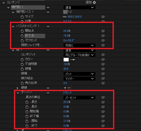 アニメーションキーフレームは単純にオフセットにのみ付けてもいいですが、シェイプ1~5の動きの緩急に合わせて軌跡を伸ばしたり縮めたりすると、よりリッチな表現になること間違いなし!
