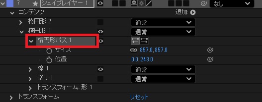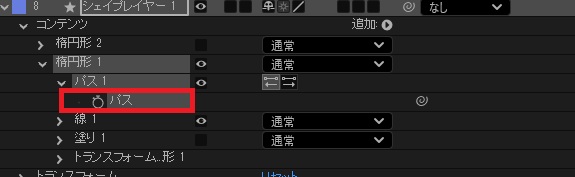 この「パス」をコピーして、シェイプ1(ぐるぐる回るオブジェ)の「位置」にペーストします。