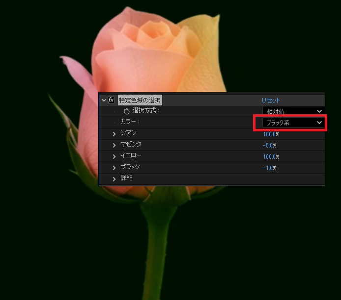 特定色域のカラーは「ブラック系」を選択し、シアン・マゼンタ・イエロー・ブラックの値を調整しながら、黒背景と被写体の色にメリハリを持たせます。